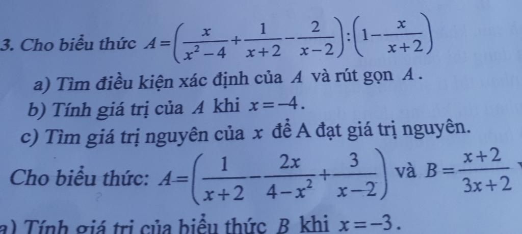 Có `: A= ( x/(x^2 -4) + 1/(x+2) - 2/(x-2) ) : (1 - x/(x+2) )`