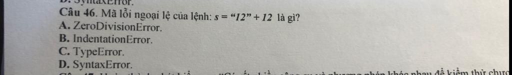 Vì bạn đang nhập phép cộng giữa một chuỗi với một số nguyên, và trong Python không được nhập như vậy dẫn tới sẽ ra lỗi " TypeError ).