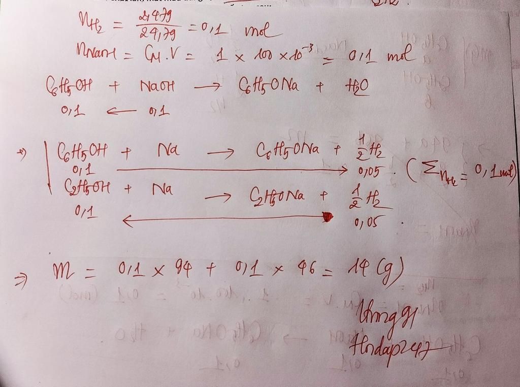 Cho m gam hỗn hợp X gồm phenol và ethanol phản ứng hoàn toàn với sodium (dư), thu được 2,479 lit khí H2 (đkc). Mặt khác, để phản ứng hoàn toàn với m gam X cần 100 mL dung dịch NaOH 1M. Tìm m