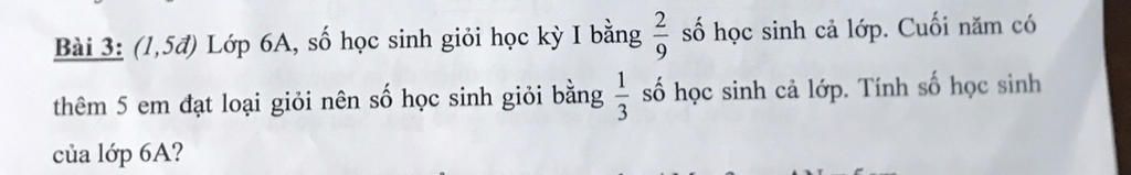 Giúp Mik vs ạ,Mik đag cần gấp ak Lớp 6A số học sinh giỏi học kỳ I bằng 2/9 số học sinh cả lớp cuối năm Có thêm 5 em đạt loại giỏi nên số học sinh giỏi bằng 1/3 số học sinh cả lớp.Tính số học sinh của lớp 6A