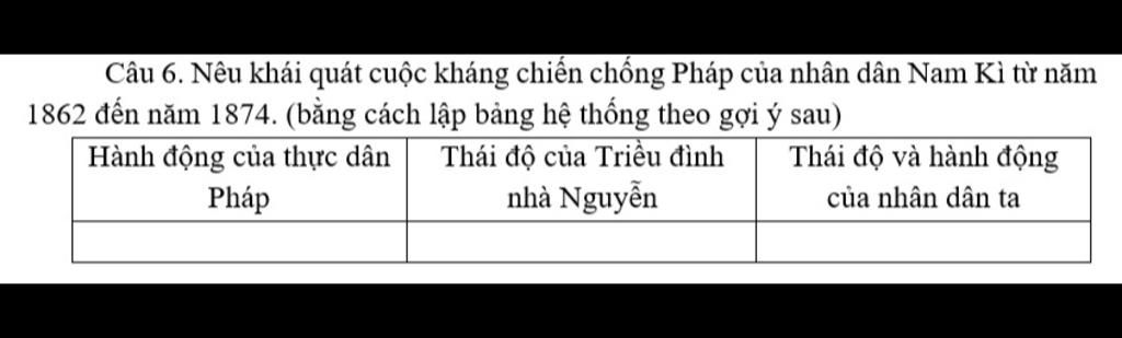 => Sau Hiệp ước Nhâm Tuất, triều đình tập trung lực lượng đàn áp các cuộc khởi nghĩa nông dân ở Bắc Kì và Trung Kì; ngăn cản phong trào kháng chiến của nhân dân Nam Kì. Lợi dụng sự bạc nhược của triều đình nhà Nguyễn, năm 1867, thực dân Pháp chiếm 3 tỉnh miền Tây Nam Kì (Vĩnh Long, An Giang, Hà Tiên)