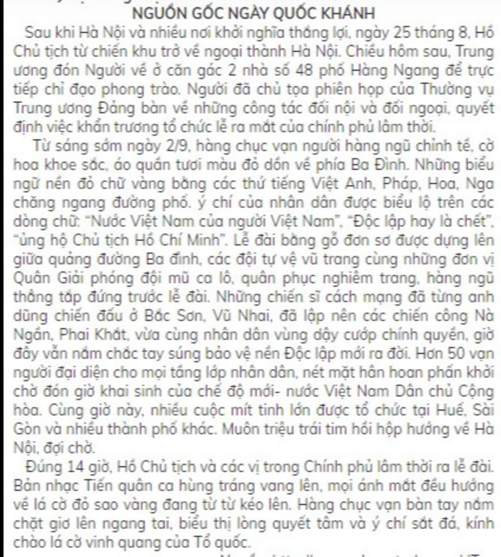 Câu 2: Sau khi đọc văn bản "NGUỒN GỐC NGÀY QUỐC KHÁNH" giúp em hiểu rõ hơn về quá trình lịch sử và những nỗ lực của người dân Việt Nam trong việc giành lại độc lập và tự do cho đất nước. Đọc văn bản này có thể khiến em cảm thấy tự hào về tinh thần đoàn kết, quyết tâm và hy sinh của các anh hùng dân tộc. Ngoài ra, em cũng có thể cảm thấy biết ơn và trân trọng những nỗ lực của các thế hệ tiền bối đã dẫn đầu cho sự phấn đấu của thế hệ sau.