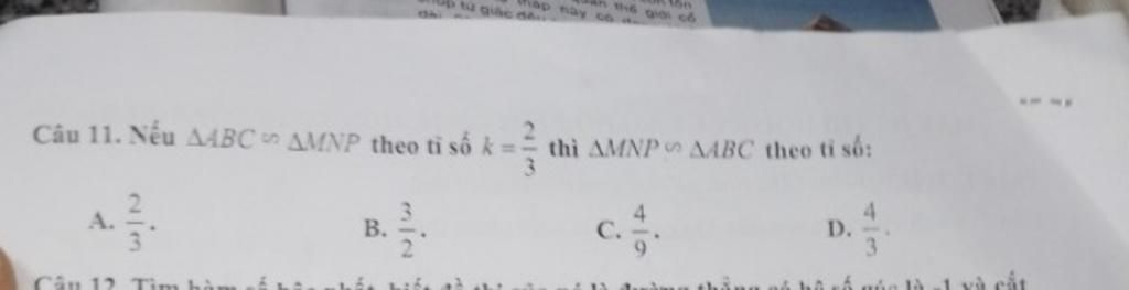 => Tam giác MNP đồng dạng tam giác ABC theo tỉ số: 1/k = 1 : 2/3 = 3/2 ( tính chất của tam giác đồng dạng )