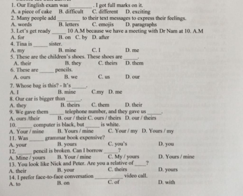 `-` Sau đại từ sở hữu không có danh từ