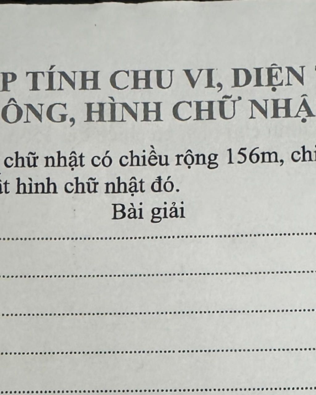 Một mảnh đất hình chữ nhật có chiều rộng 156 m, chiều dài hơn chiều rộng 17m , tính chu vi hình chứ nhật