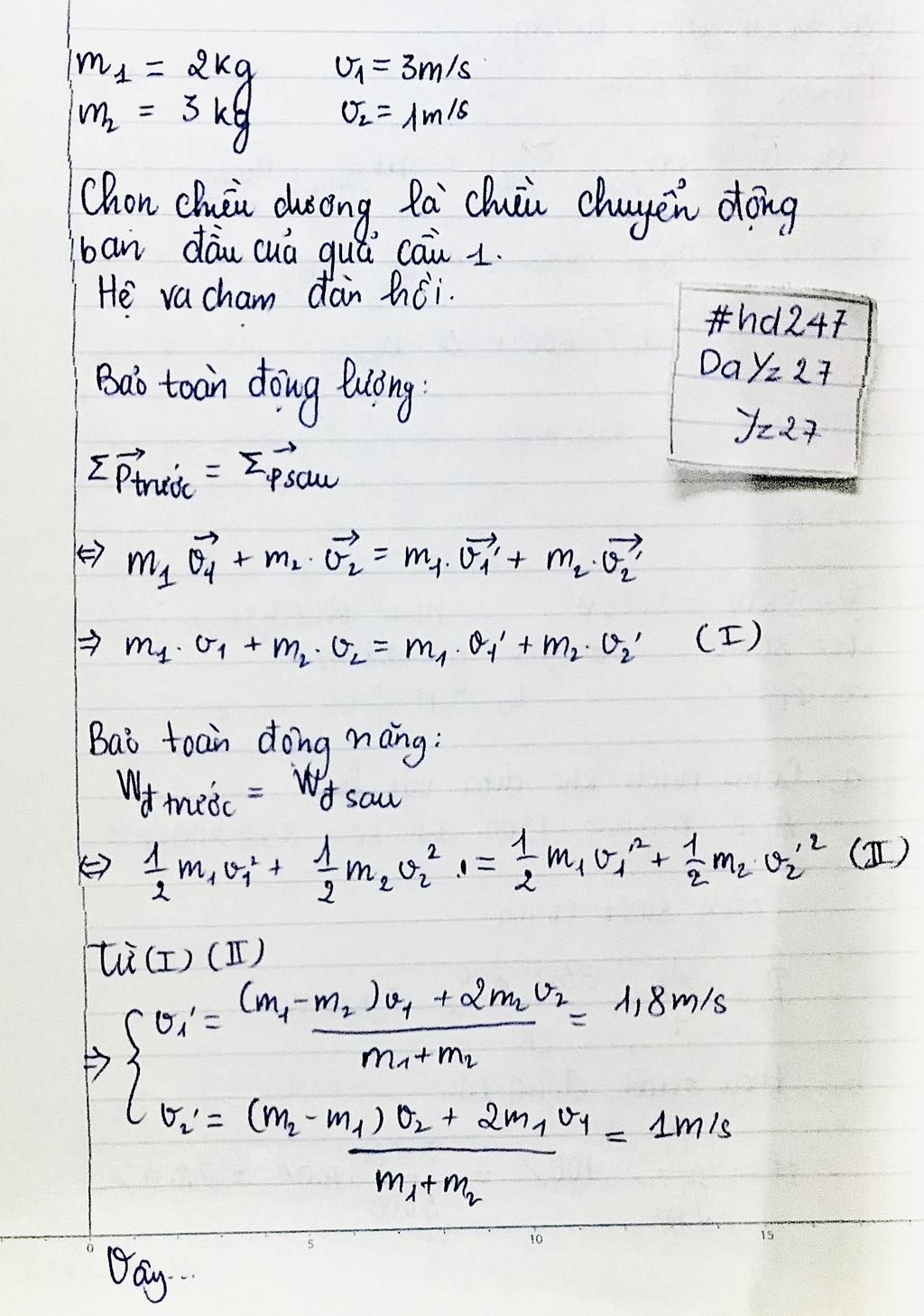 Một quả cầu khối lượng 2kg chuyển động với vận tốc 3 m/s tới va chạm xuyên tâm vào quả cầu thứ hai khối lượng 3 kg đang chuyển động với vận tốc 1 m/s cùng chiều với quả cầu thứ nhất. Hãy xác định vận tốc của hai quả cầu sau khi va chạm trong trường hợp hai quả cầu va chạm hoàn toàn đàn hồi