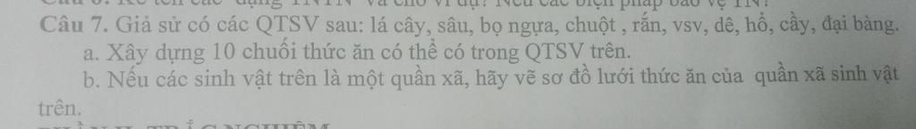 Giả sử có các QTSV sau :Lá cây, sâu, bọ ngựa, chuột, rắn, vsv, dê, hổ, cầy, đại bàng.