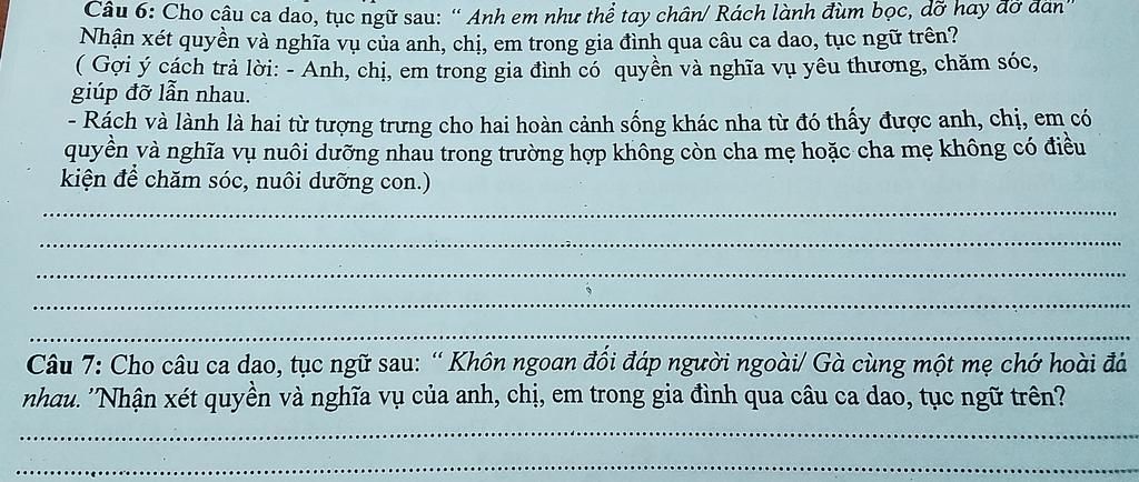 6)Trong ca dao trên, nghĩa vụ của anh chị em đc nhấn mạnh thông qua sự đoàn kết,hỗ trợ lẫn nhau như cách tay và chân hỗ trợ nhau trong cơ thể tạo nên sực mạnh và sự ổn định