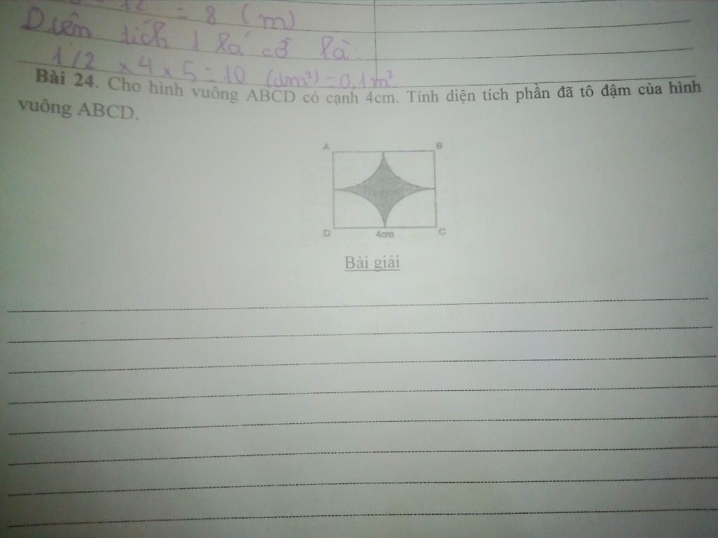 Giải thích các bước giải: 4 phần chưa tô dậm tạo thành 1 hình tròn có bán kính = 2cm