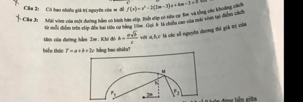 – Câu 3: Mái vòm của một đường hầm có hình bán elip. Biết elip có tiêu cự 8m và tổng các khoảng cách