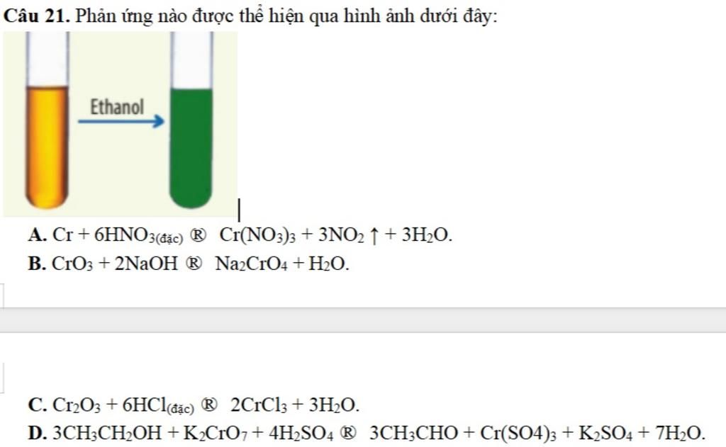 Giải thích các bước giải: vì có sự tham gia của ethanol là CH3CH2OH, phản ứng được sử dụng cho máy đo nồng độ cồn