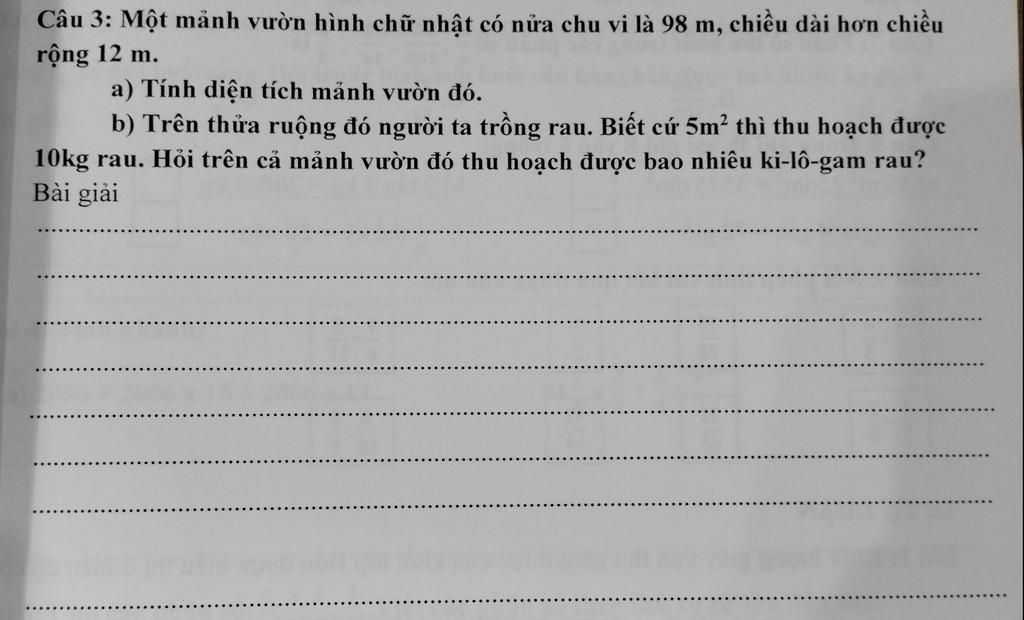 `b)` Cả mảnh vườn đó thu hoạnh được số rau là :