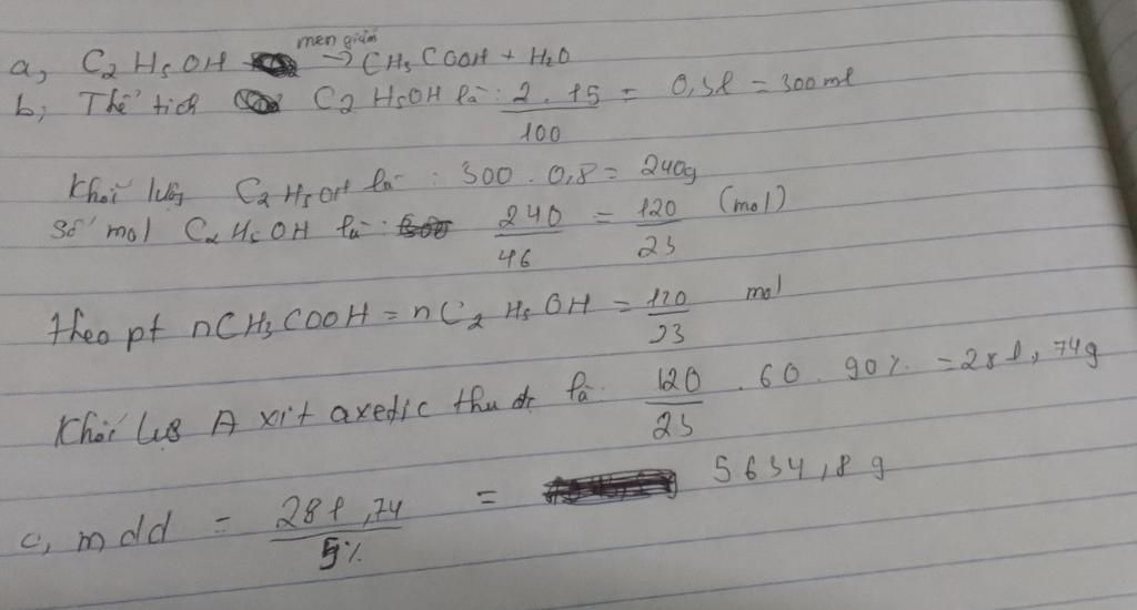 c .nếu pha dung dịch sau lên men ở trên thành giấm ăn chứa 5% axit axetic thì khối lượng giảm a thu được là bao nhiêu