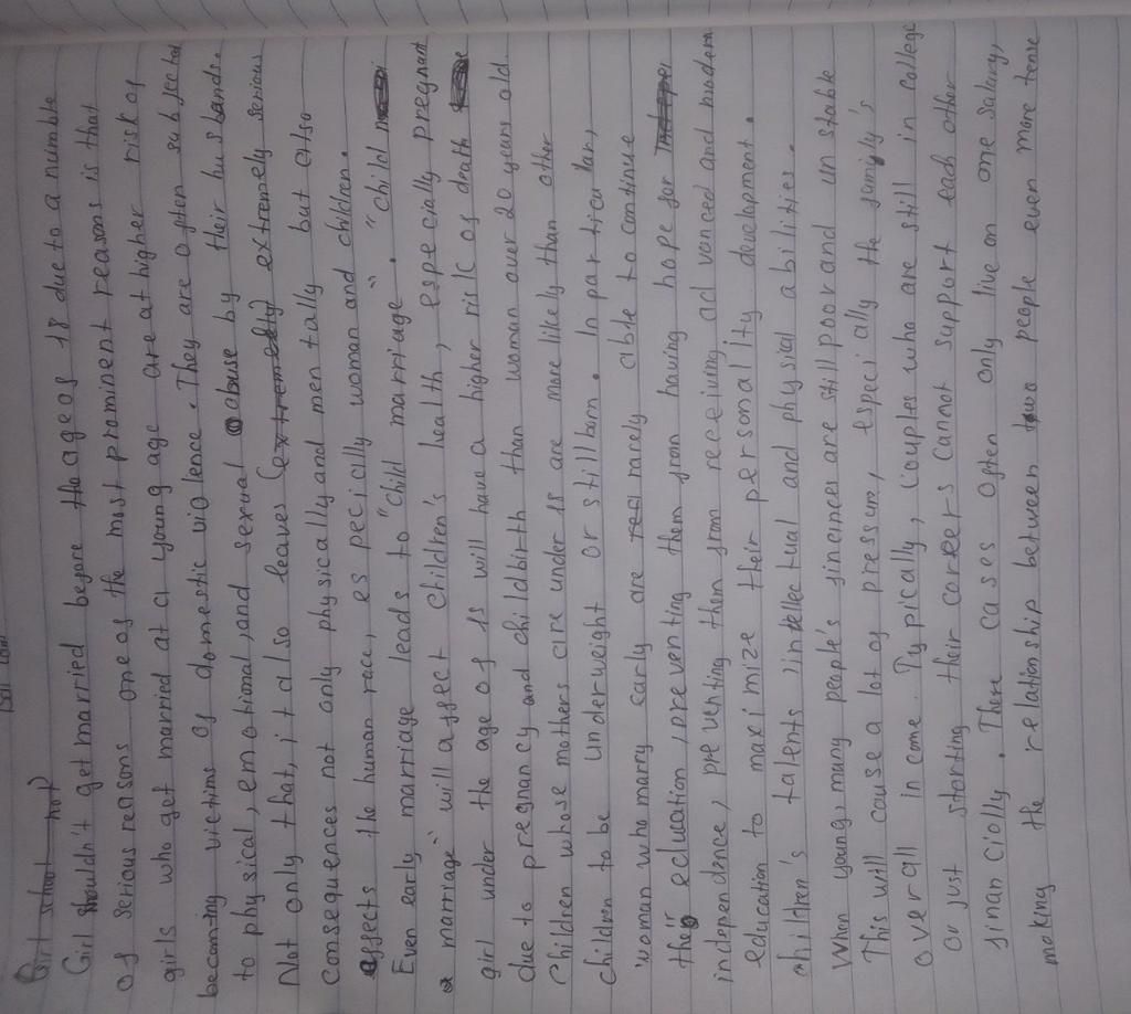 Dịch tạm : Các cô gái không nên kết hôn trước 18 tuổi vì một số lý do nghiêm trọng. Một trong những nguyên nhân nổi bật là trẻ em gái kết hôn khi còn quá trẻ có nguy cơ cao trở thành nạn nhân của bạo lực gia đình. Họ thường phải chịu sự lợi dụng về thể chất, tình cảm và tình dục bởi người chồng của họ . Không chỉ vậy, nó còn để lại hậu quả vô cùng nghiêm trọng không chỉ về thể xác, tinh thần mà thậm chí còn ảnh hưởng đến giống nói đặc biệt là tác động tiêu cực đến phụ nữ và trẻ em.Thậm chí kết hôn sớm còn dẫn đến việc 'tảo hôn' . 'Tảo hôn' sẽ làm cho sức khỏe của trẻ em bị ảnh hưởng đặc biệt là trẻ em gái dưới độ tuổi 15 mang thai sẽ có nguy cơ chết do mang thai và sinh đẻ cao hơn so với phụ nữ trên 20 tuổi. Những đứa trẻ có mẹ dưới 18 tuổi có nhiều khả năng nhẹ cân hoặc chết non cao hơn những đứa trẻ khác.Đặc biệt người phụ nữ kết hôn sớm ít khi được tiếp tục việc học hành, cản trở họ có hy vọng về sự độc lập, cản trở họ được tiếp thu những nền giáo dục tiên tiến, hiện đại nhằm phát triển tối đa nhân cách, tài năng, các khả năng về trí tuệ và thể chất của trẻ em;Khi còn ít tuổi, tài chính của nhiều người vẫn còn kém, chưa ổn định. Điều này sẽ gây ra rất nhiều áp lực, đặc biệt là vấn đề thu nhập chung của gia đình. Điển hình là cặp đôi vẫn đang học đại học hoặc mới bắt đầu sự nghiệp không thể hỗ trợ tài chính cho nhau. Các trường hợp này thường chỉ sống nhờ một đồng lương, khiến mối quan hệ giữa hai người càng thêm căng thẳng.