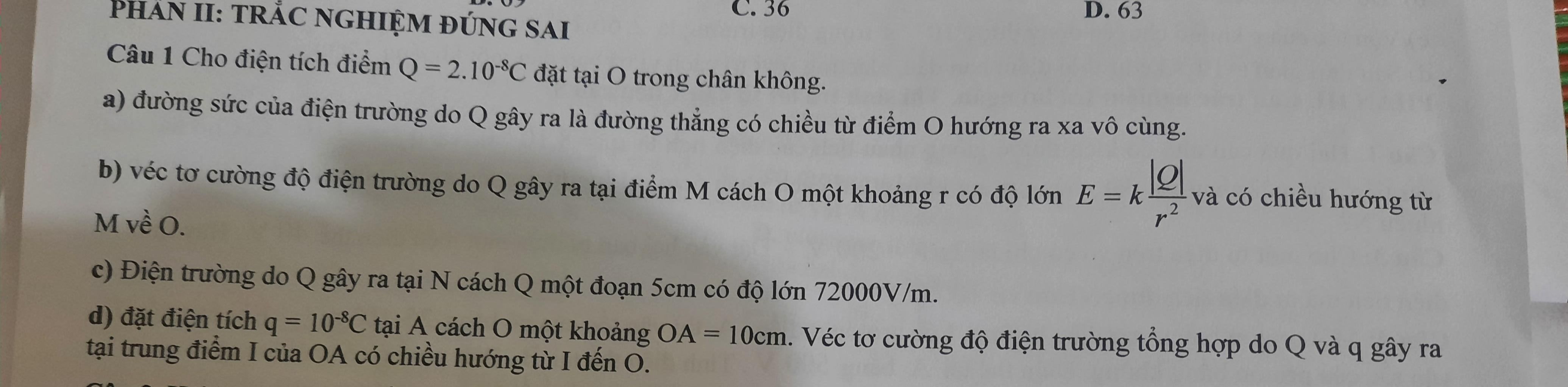 {E_1} = \dfrac{{k.Q}}{{r_1^2}} = \dfrac{{{{9.10}^9}{{.2.10}^{ - 8}}}}{{0,{{05}^2}}} = 72000\left( {V/m} \right)\\