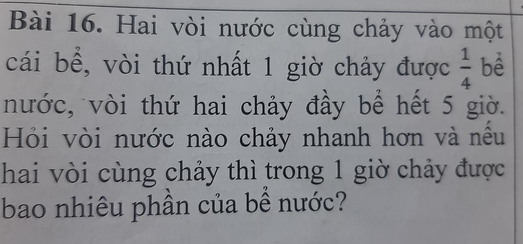 Vì `5/20>4/20` nên `1/4>1/5` hay vòi thứ nhất chảy nhanh hơn vòi thứ hai