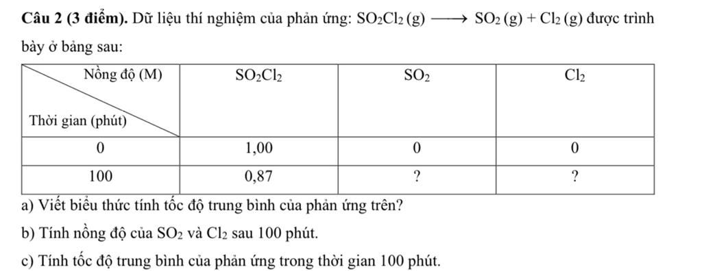 $\rm \quad v_{tb}=\dfrac{\Delta C_{SO_2}}{\Delta t}=\dfrac{\Delta C_{Cl_2}}{\Delta t}\\⇔\ \dfrac{a-0}{100}=1,3×10^{-3}\ (M/min)\\⇔ \ a=0,13\ (M)$