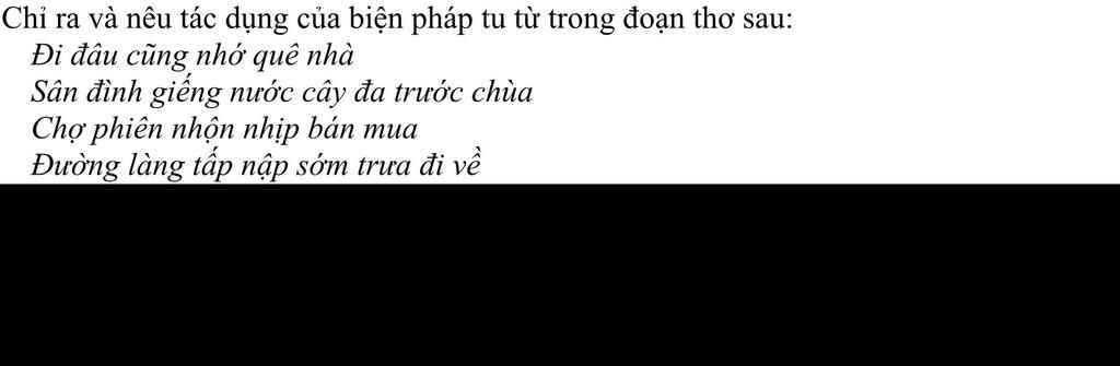 Tác dụng: giiups lầm tăng tính gợi hình, gợi cảm cho sự diễn đạt và tạo nhịp điệu, sự hài hòa cho câu thơ. Liệt kê những cảnh vật quê hương như cây đa, giếng nước, sân đình và cả những kỉ niệm chẳng thể nào quên của phiên chợ nhộn nhịp, cảnh đường làng tấp nập người qua lại. Có thể cảm nhận được qua câu thơ là nỗi nhớ, tình thương của tác giả đối với quê hương.