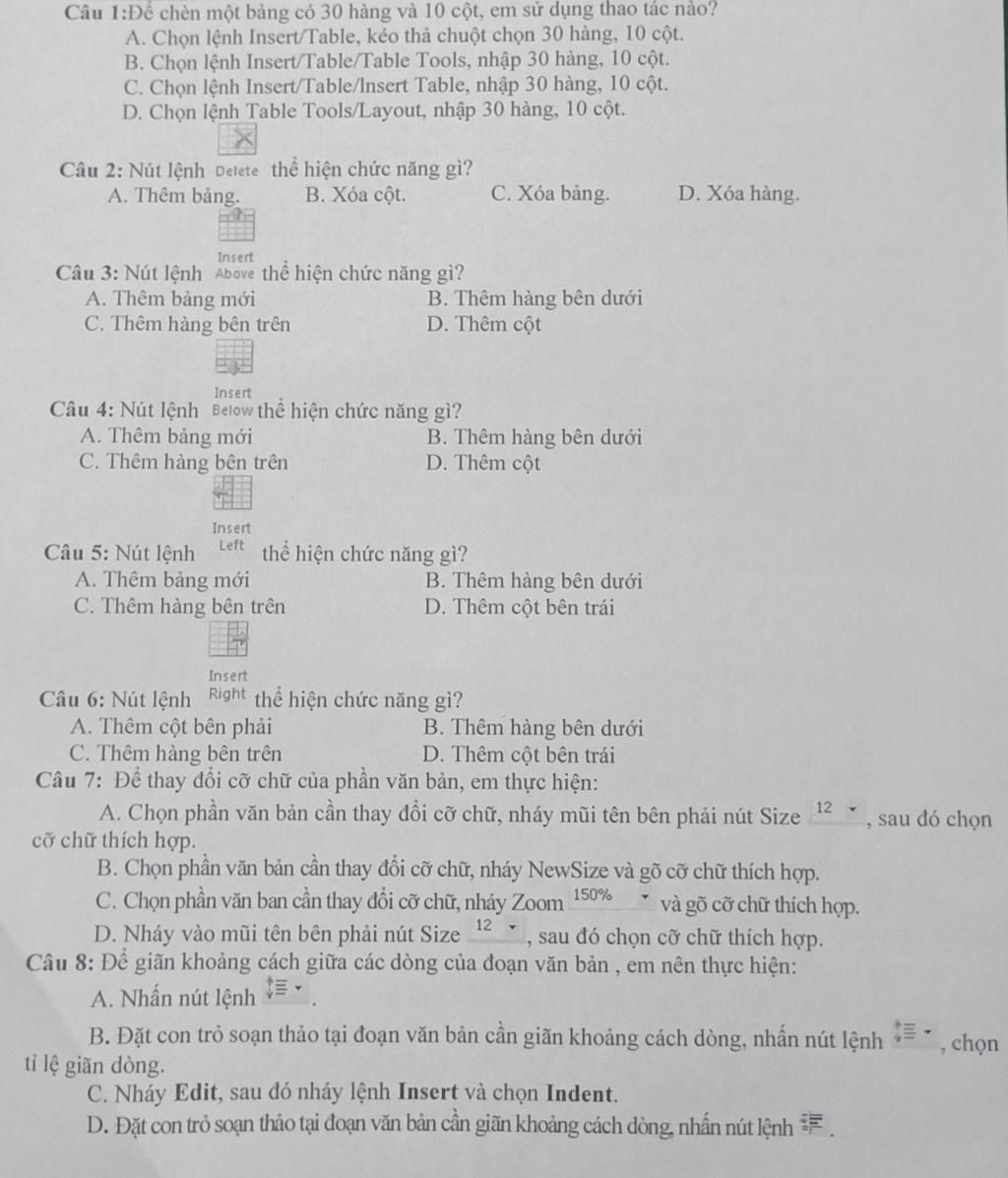 Câu 1:Để chèn một bảng có 30 hàng và 10 cột, em sử dụng thao tác nào?