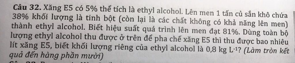 $\Rightarrow m_{\text{ethanol tạo ra}}=\dfrac{307,8.92}{162}=174,8kg$
