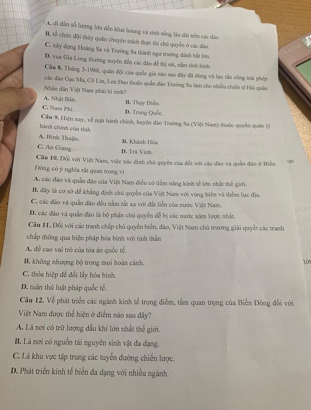 Câu 7 bị che : dưới thời vua Gia Long, hoạt động khẳng định chủ quyền đối với quần đảo Hoàng Sa , quần đảo Trường Sa được thể hiện qua việc còn tt trong ảnh