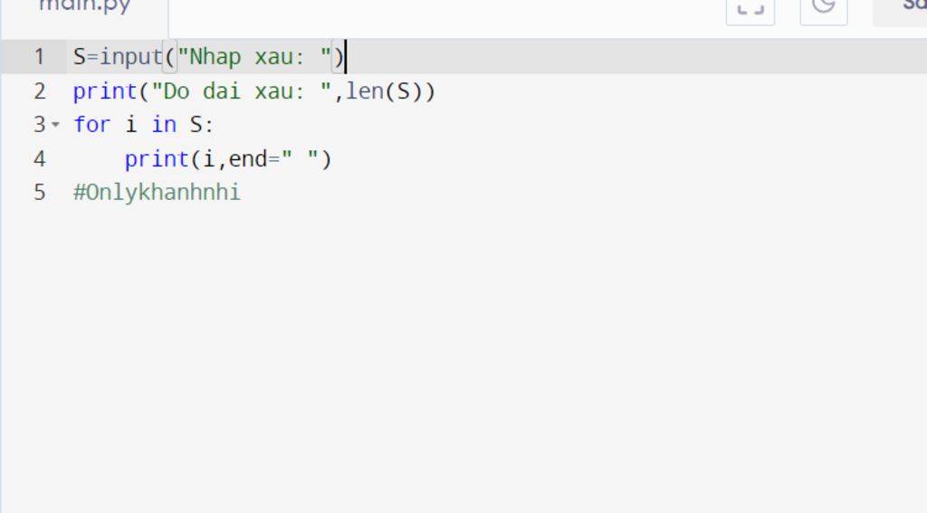 Viết chương trình để nhập xâu S từ bàn phím. In ra màn hình độ dài xâu S, xâu S (sử dụng câu lệnh for và xâu S in theo hàng ngang)?Python ạ,mk cảm ơn trước nha