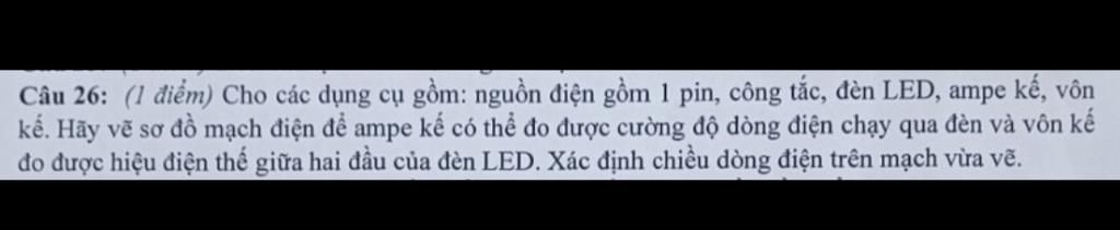 Câu 26: (1 điểm) Cho các dụng cụ gồm: nguồn điện gồm 1 pin, công tắc, đèn LED, ampe kế, vôn