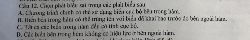 B,Biến bên trong hàm có thể trùng tên với biến đã khai báo trước đó bên ngoài hàm.