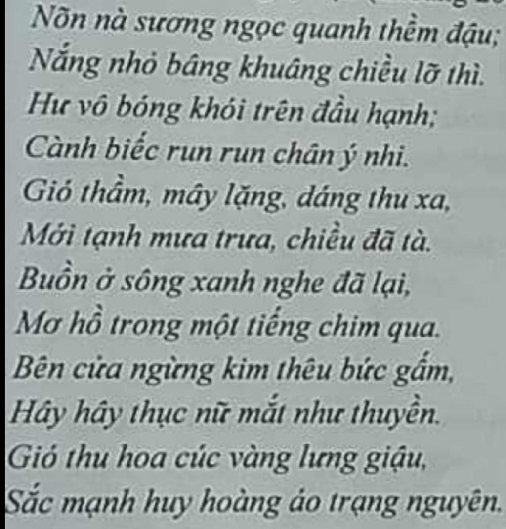 Trong bài thơ này, tác giả sử dụng nhiều hình ảnh sinh động và ẩn dụ để tạo nên một bức tranh thơ mộng về mùa thu.Ngay từ đầu, hình ảnh "nõn nà sương ngọc quanh thêm đậu" đã gợi lên cảm giác về sự trong sáng, tinh khiết của thiên nhiên vào buổi sáng sớm, khi những giọt sương đọng trên lá đậu như những viên ngọc lấp lánh. Điều này tạo nên một không gian yên bình, thanh thoát.Tiếp theo, tác giả dùng hình ảnh "nắng nhỏ bâng khuâng chiều lỡ thì" để diễn tả sự chuyển mình của thời gian, khi ánh nắng chiều dần phai nhạt, báo hiệu sự kết thúc của một ngày. Hình ảnh "bâng khuâng" gợi cảm giác về sự lãng mạn, suy tư.Trong những câu tiếp theo, tác giả sử dụng nhiều hình ảnh ẩn dụ như "hư vô bỏng khói trên đầu hạnh", "cành biếc run run chân ý nhi", "gió thầm, mây lặng, dáng thu xa" để tạo nên một không gian thơ mộng, ẩn chứa những cảm xúc sâu lắng về mùa thu.Đặc biệt, hình ảnh "bên cửa ngừng kim thêu bức gấm, hây hây thục nữ mắt như thuyền" và "gió thu hoa cúc vàng lung giậu, sắc mạnh huy hoàng áo trạng nguyên" đã tạo nên những bức tranh sinh động về một cô gái xinh đẹp, thanh lịch trong không gian thu vàng.Thông qua việc sử dụng các hình ảnh mang tính ẩn dụ, liên tưởng, tác giả đã tạo nên một bức tranh thơ mộng, lãng mạn về mùa thu, gợi lên những cảm xúc sâu lắng về vẻ đẹp của thiên nhiên và con người.