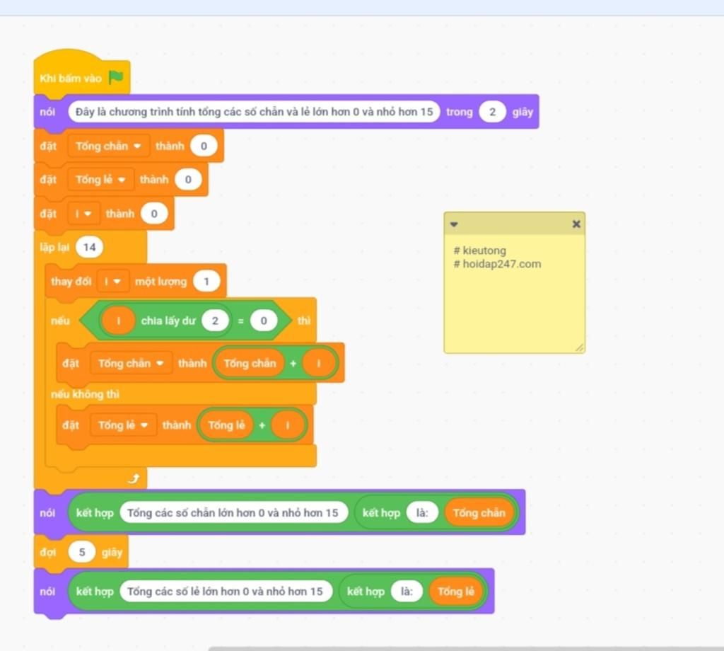Tính tổng các số chẵn lẻ lớn hơn 0 nhỏ hơn 15 trên scratch