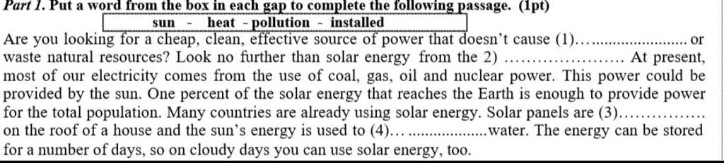 Are you lookng for a cheaps,clean,effective source of power that doesn't case(1)pollution waste naturel resources?Look no futher than solar power from the(2)sun.At present,most of out electricity comes from the use of coal,gas,oil and nuclear power.This power could be prorided by the sun.One percent of solar energy that reaches the Earth is enough to provide power for the total population.Many countries are already using solar energy.Solar panels are(3)installed on the roof of a house and the sun's energy is used to (4)heat water . The energy can be stored for a number of days,so on cloudy days you can use solar energy,too
