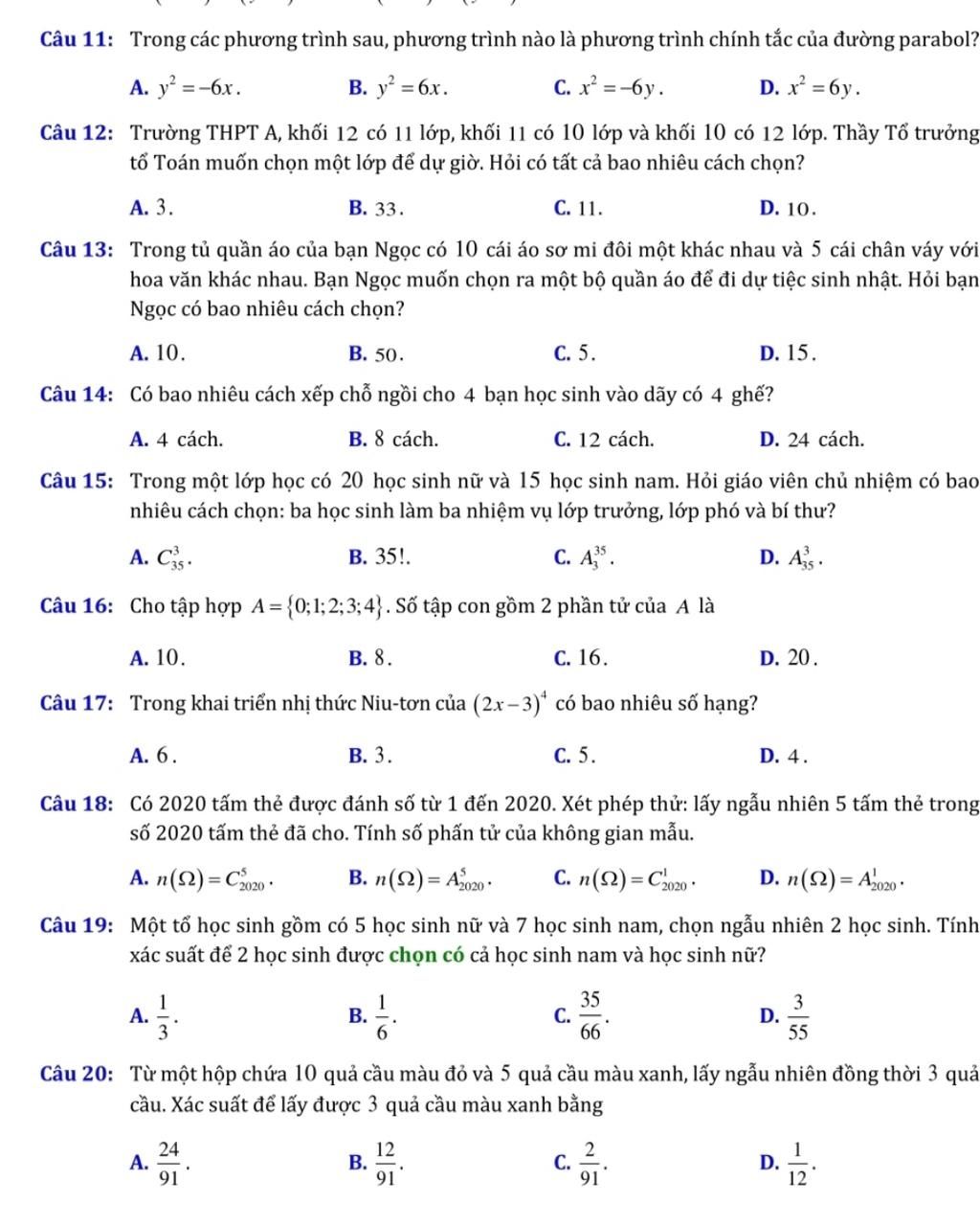 Câu 12: Trường THPT A, khối 12 có 11 lớp, khối 11 có 10 lớp và khối 10 có 12 lớp. Thầy Tổ trưởng