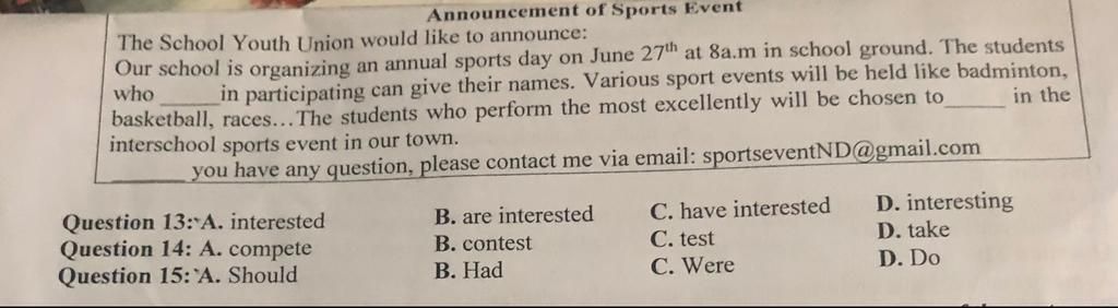 chị ơi em tưởng câu 15 phải là should (câu đk loại 1 rút gọn) Bởi vì ko có dấu hỏi nên ko dùng cấu trúc của câu hỏi đc