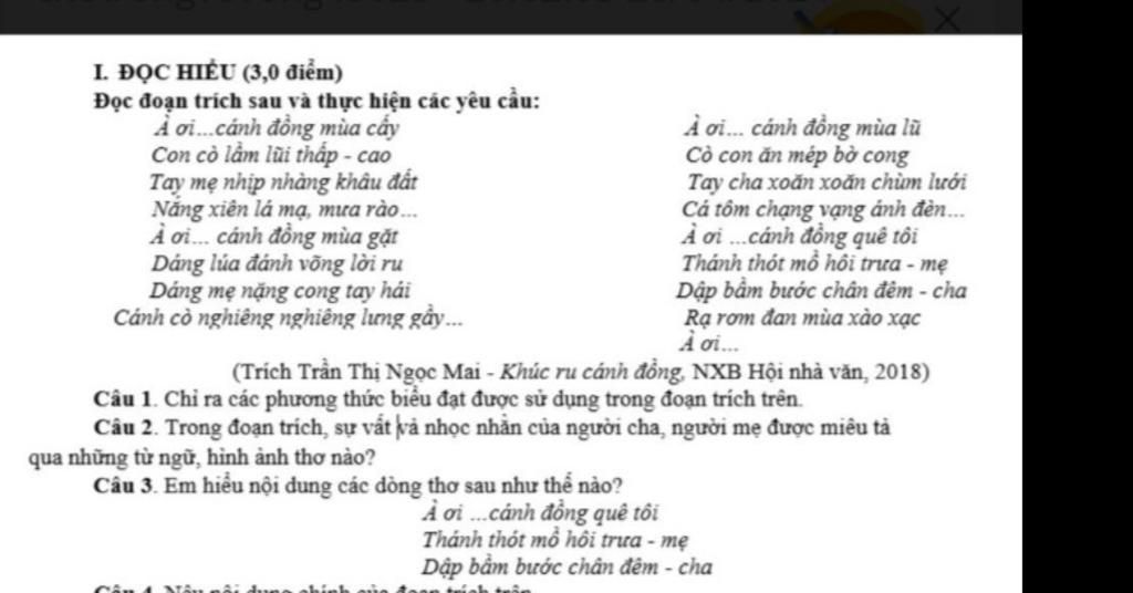 Câu 3. Các dòng thơ "À ơi ...cảnh đồng quê tôi / Thánh thót mồ hôi trưa - mẹ / Dập bầm bước chân đêm - cha" thể hiện: