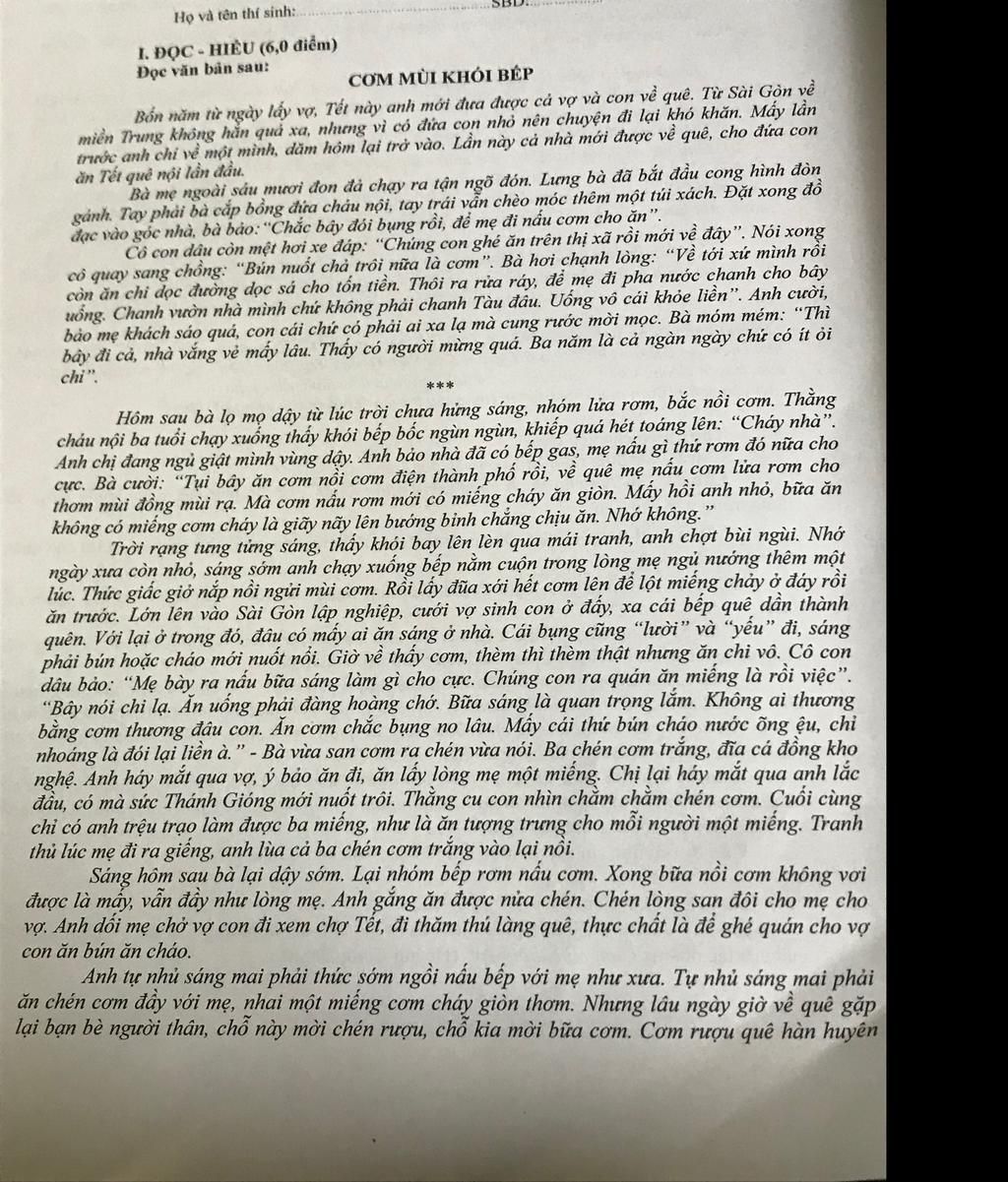 Bà mẹ ngoài sáu mươi đon đả chạy ra tận ngõ đón. Lưng bà đã bắt đầu cong hình đòn gánh. Tay phải bà cắp bồng đứa cháu nội, tay trái vẫn chèo móc thêm một túi xách. Đặt xong đồ đạc vào góc nhà, bà bảo: “Chắc bây đói bụng rồi, để mẹ đi nấu cơm cho ăn”. Cô con dâu còn mệt hơi xe đáp: “Chúng con ghé ăn trên thị xã rồi mới về đây”. Nói xong cô quay sang chồng: “Bún nuốt chả trôi nữa là cơm”.