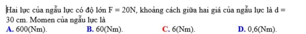 `M = F . d = 20 . 0,3 = 6(Nm)`