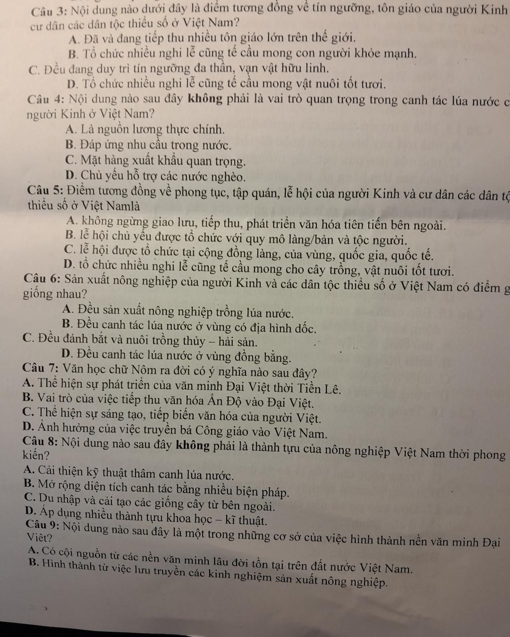 Câu 3: Nội dung nào dưới đây là điểm tương đồng về tín ngưỡng, tôn giáo của người Kinh