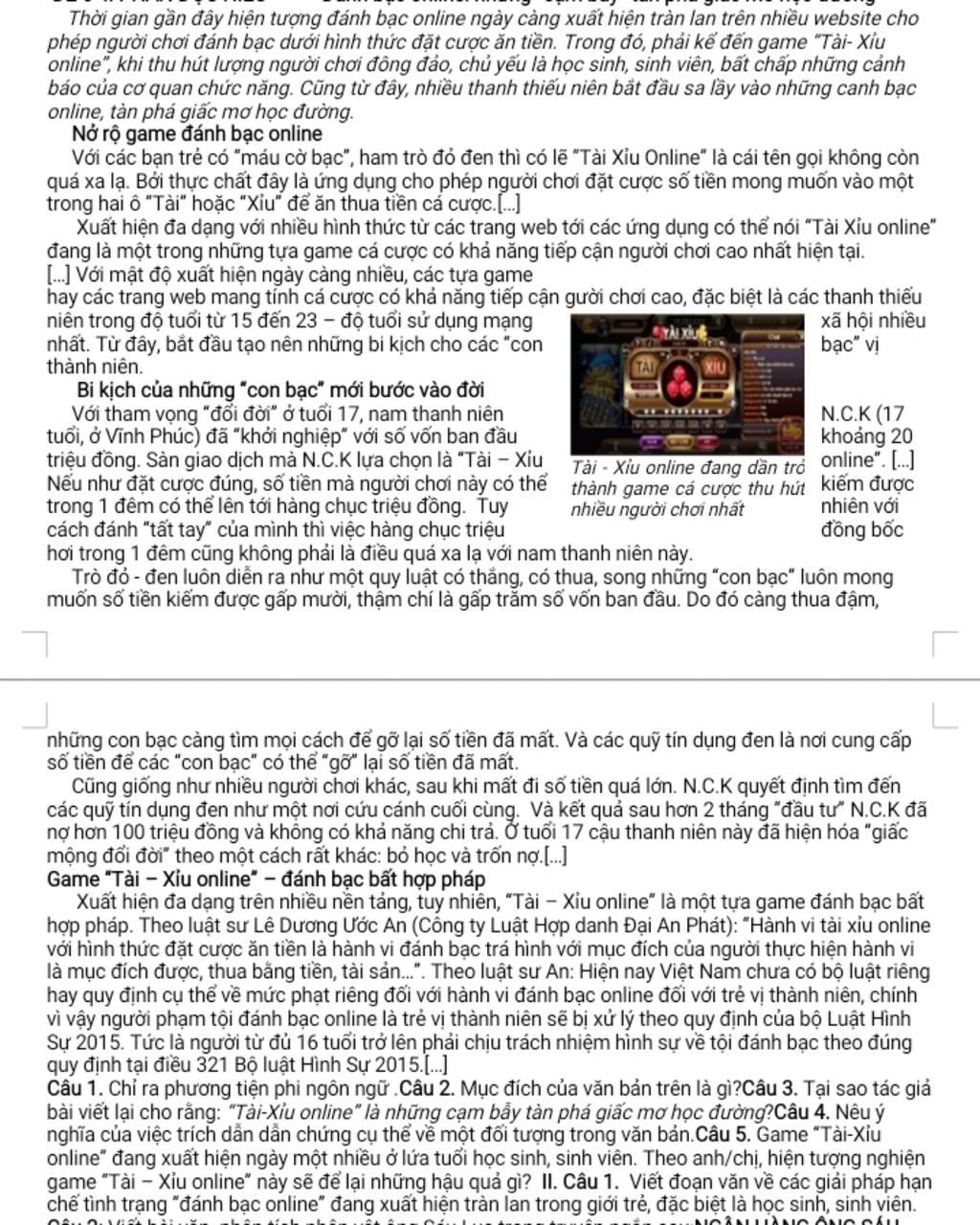 Câu 4: Việc trích dẫn dẫn chứng cụ thể đối tượng trong văn bản giúp người đọc dễ hình dung được tác hại khủng khiếp mà trò chơi "Tài-Xỉu online" mang lại cho người chơi, đồng thời cần nhấn mạnh hậu quả sau khi đánh đổi hết kinh tế của bản thân vào trò chơi này.