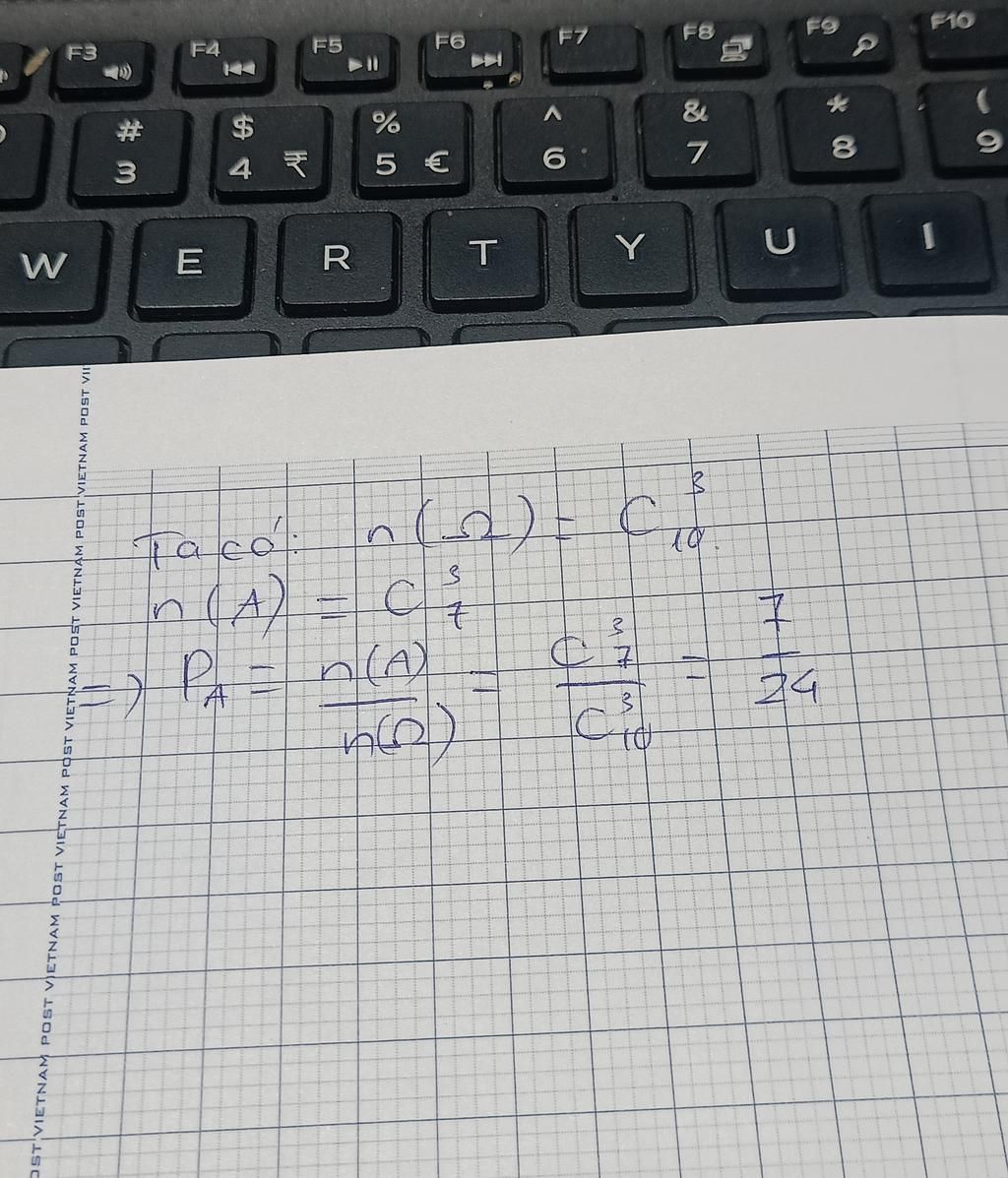 Số cách chọn ngẫu nhiên 3 quả trong 10 quả bóng là: `C_10^3` (cách)