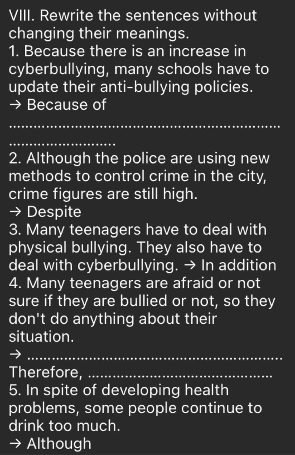 Đáp án:1. Because of the increase in cyber bullying, many schools have to update their anti-bullying policies.