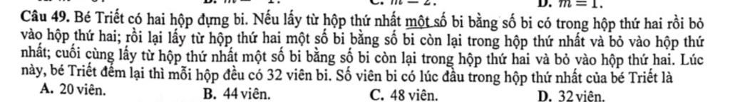 $\to$Hộp $1$ có $x-y$ viên bi, hộp $2$ có $2y$ viên bi
