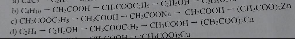 $\rm c)\\ CH_3COOC_2H_5+H_2O\xrightarrow{Acid ,\ t^°}CH_3COOH+C_2H_5OH\\CH_3COOH+Na\to CH_3COONa+\dfrac{1}{2}H_2\\CH_3COONa+HCl\to CH_3COOH+NaCl\\2CH_3COOH+Zn\to (CH_3COO)_2Zn+H_2\\d)\\ C_2H_4+H_2O\xrightarrow{H_2SO_4\ (dac),\ t^°}C_2H_5OH\\C_2H_5OH+CH_3COOH\overset{H_2SO_4\ (dac),\ t^°}\leftrightarrows CH_3COOC_2H_5+H_2O\\CH_3COOC_2H_5+H_2O\xrightarrow{Acid ,\ t^°}CH_3COOH+C_2H_5OH\\2CH_3COOH+Ca\to (CH_3COO)_2Ca+H_2$