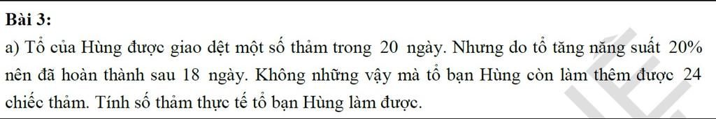 `=>` Số thảm tổ của Hùng thực tế làm được trong `1` ngày là `120%x=1,2x(thảm)`