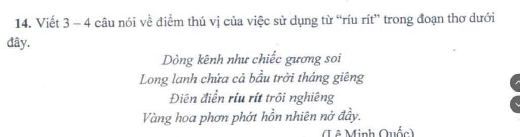 `⇒` Tác giả đã thực sự tinh tế khi khéo léo kết hợp tính từ láy "ríu rít" để miêu tả hình ảnh của những bông điên điển trôi sông. Điều này đã góp phần thể hiện được vẻ đẹp thiên nhiên của một vùng quê thanh bình, tươi đẹp mà lại mộc mạc một cách rõ ràng, sống động. Nó tựa như một thứ âm thanh ám chỉ tới giọng hót của tiếng chim ngân vang, nhưng chất chứa trong đó là sự kết hợp hài hòa giữa nhịp điệu văn thơ và hiệu quả của biện pháp nghệ thuật nhân hóa. Chính nhờ sự sử dụng ngôn từ thú vị ấy mà tác giả đã có thể đưa bài thơ lên một tầm cao mới `-` nơi bắt nguồn từ sự cảm nhận tinh tế, khéo léo trong lòng mỗi độc giả văn thơ.