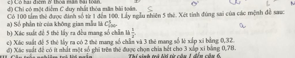 Xác suất để lấy ra `5` thẻ đều mang số chẵn : `(C_50^5)/(C_100^5)=1081/38412`