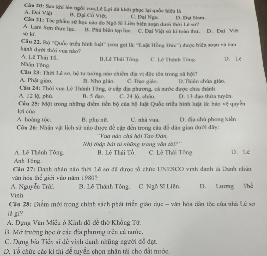 Câu 20: Sau khi lên ngôi vua,Lê Lợi đã khôi phục lại quốc hiệu là