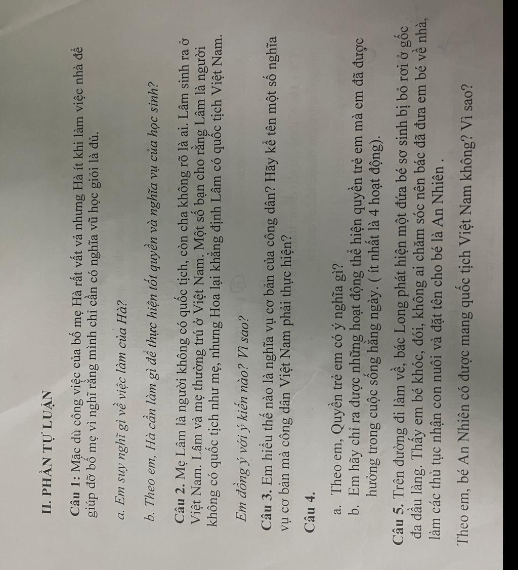 +Em đồng ý với ý kiến của Hoa vì trẻ em k có cha là ai mẹ cũng k có quốc tịch nhưng lại sinh ra ở Việt Nam thì là người thuộc quốc tịch Việt Nam.