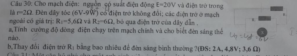 {U_1} = E - {U_{dm}} - Ir = 20 - 6 - 2,5.2 = 9V\\