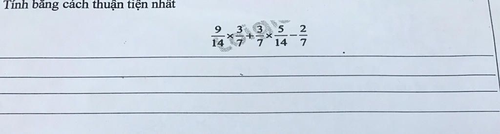 `9/14xx3/7+3/7+5/14-2/7``=3/7(9/14+1)+5/14-4/14``=3/7xx23/14+1/14``=69/98+7/98``=76/98=38/49`