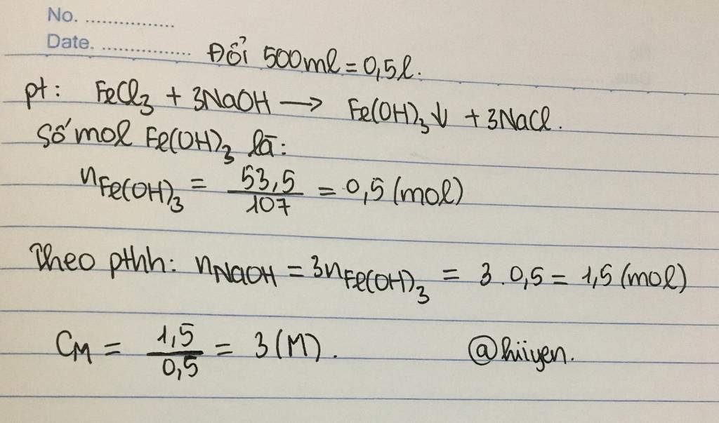 Cho dung dịch muối FeCl3 tác dụng với 500 mL dung dịch NaOH vừa đủ, thu được 53,5 g kết tủa. Tính nồng độ dung dịch NaOH đã dùng